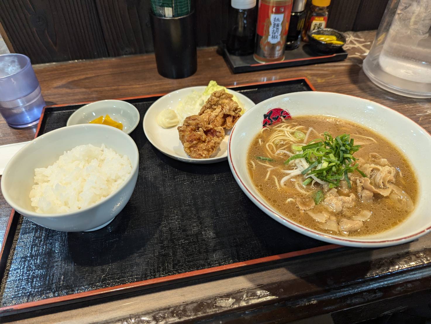 徳島県鳴門市にある、徳島らーめん ふく利 鳴門店に入ってメニューが豊富だったので、何を頼むか迷いましたが、この日は鶏の唐揚げセット(徳島らーめん並、唐揚げ、ごはん小)1,250円を注文しました。
